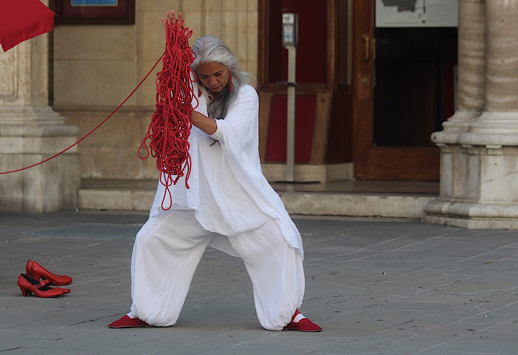 Immer fragen Leute nach den roten Schuhen. Das ist eine Referenz auf Installationen, die weltweit gemacht werden um auf die steigende Zahl an Femizide, oder Feminizide, aufmerksam zu machen. OBRA hat schon mehrmals an die 80 Paar rote Schuhe ausgestellt. Meistens haben wir darin auch performt. Bei RED Silence schaffe ich es nicht mehr als 7 Paare täglich selber zu transportieren…..